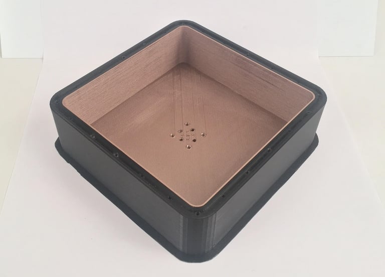 Electrifi is used as the printed conductive material forming the RF-active surfaces and cavity walls of 3D-printed frequency-diverse metasurface antennas, eliminating the need for metal machining or post-print metallization.