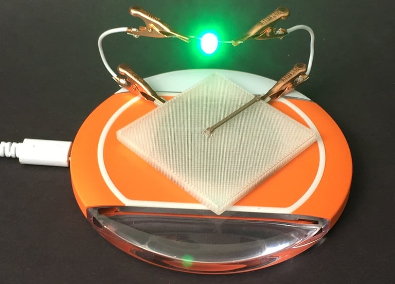 The 3D printed 9-turn spiral inductor is able to receive wireless power from a commercial wireless phone charger to light up an LED.